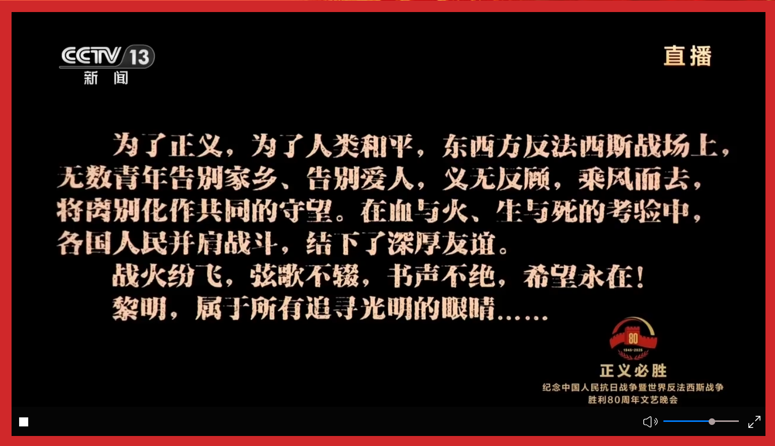 紀(jì)念中國(guó)人民抗日戰(zhàn)爭(zhēng)暨世界反法西斯戰(zhàn)爭(zhēng)勝利80周年文藝晚會(huì)到此結(jié)束!