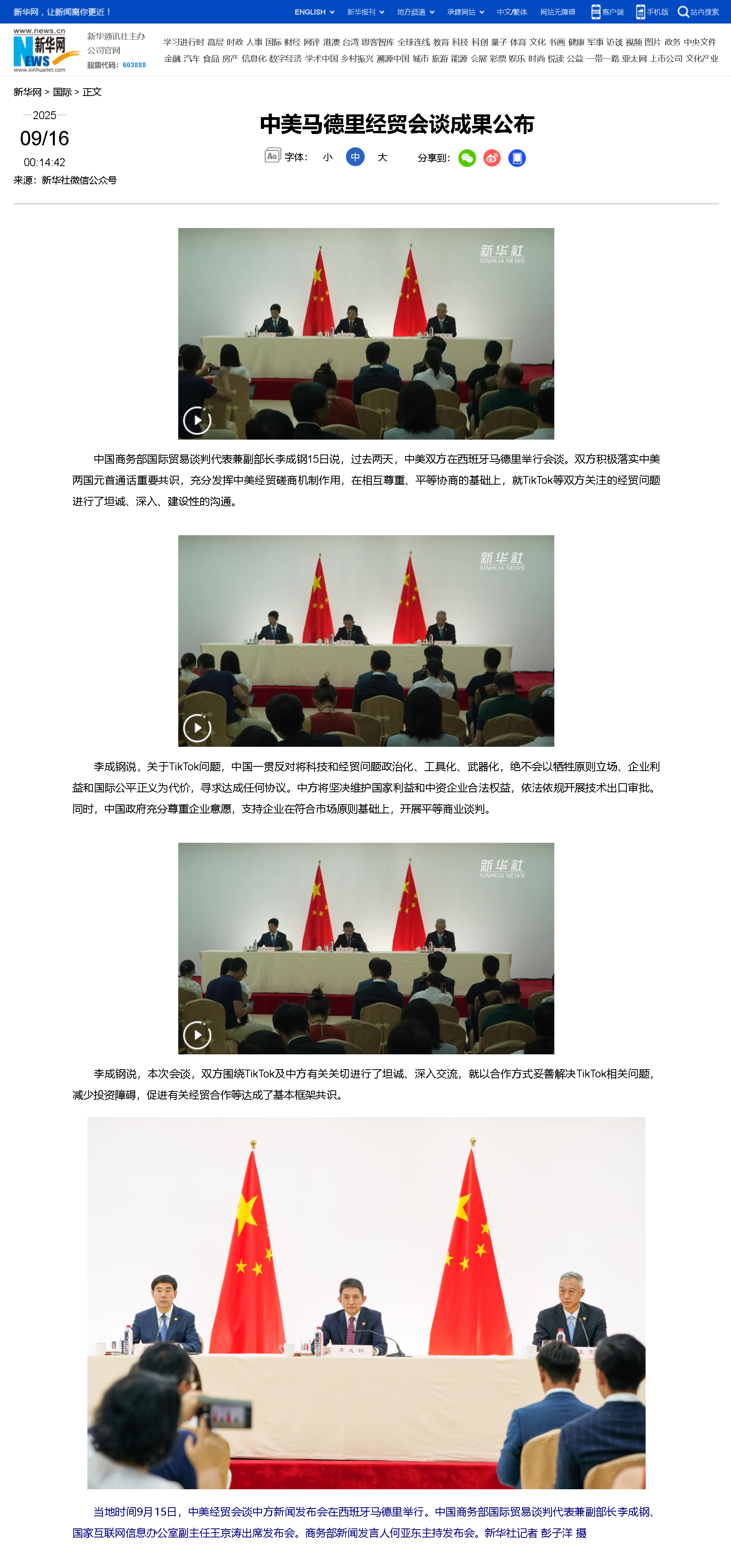 新華社快訊:中國(guó)商務(wù)部國(guó)際貿(mào)易談判代表兼副部長(zhǎng)李成鋼15日說(shuō),過(guò)去兩天,中美雙方在西班牙馬德里舉行會(huì)談。雙方積極落實(shí)中美兩國(guó)元首通話重要共識(shí),充分發(fā)揮中美經(jīng)貿(mào)磋商機(jī)制作用,在相互尊重、平等協(xié)商的基礎(chǔ)上,就TikTok等雙方關(guān)注的經(jīng)貿(mào)問(wèn)題進(jìn)行了坦誠(chéng)、深入、建設(shè)性的溝通。