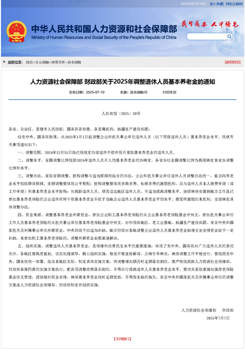 日前,人力資源社會(huì)保障部、財(cái)政部印發(fā)《關(guān)于2025年調(diào)整退休人員基本養(yǎng)老金的通知》。具體如何調(diào)整,一起來(lái)了解一下。