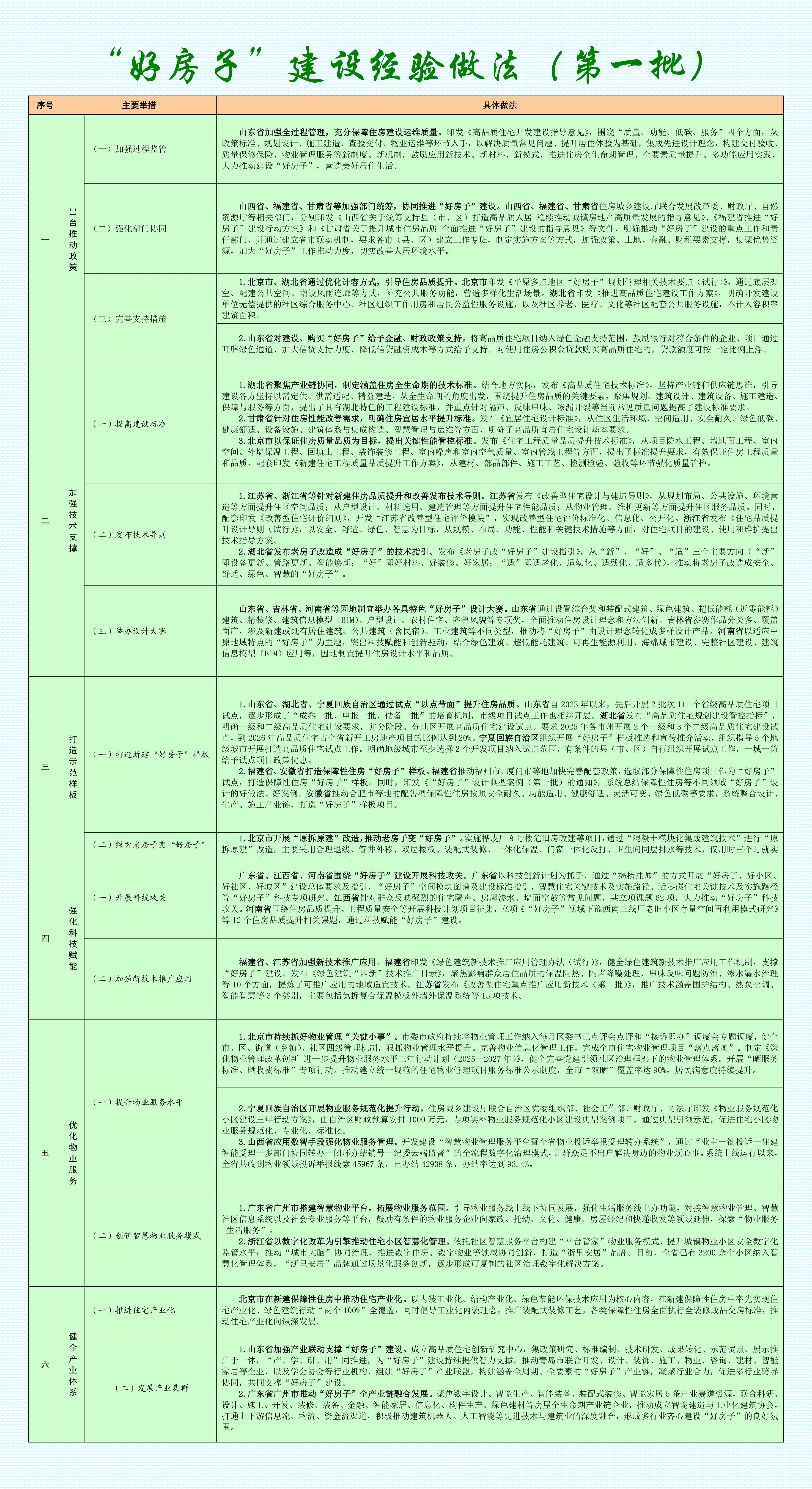 在打造示范樣板上,清單中既有打造新建“好房子”樣板的做法,也有探索老房子變“好房子”的實踐。在強化科技賦能上,廣東省、江西省、河南省圍繞“好房子”建設開展科技攻關;福建省、江蘇省加強新技術推廣應用。在優(yōu)化物業(yè)服務上,地方實踐經驗聚焦于提升物業(yè)服務水平和創(chuàng)新智慧物業(yè)服務模式兩個方面。