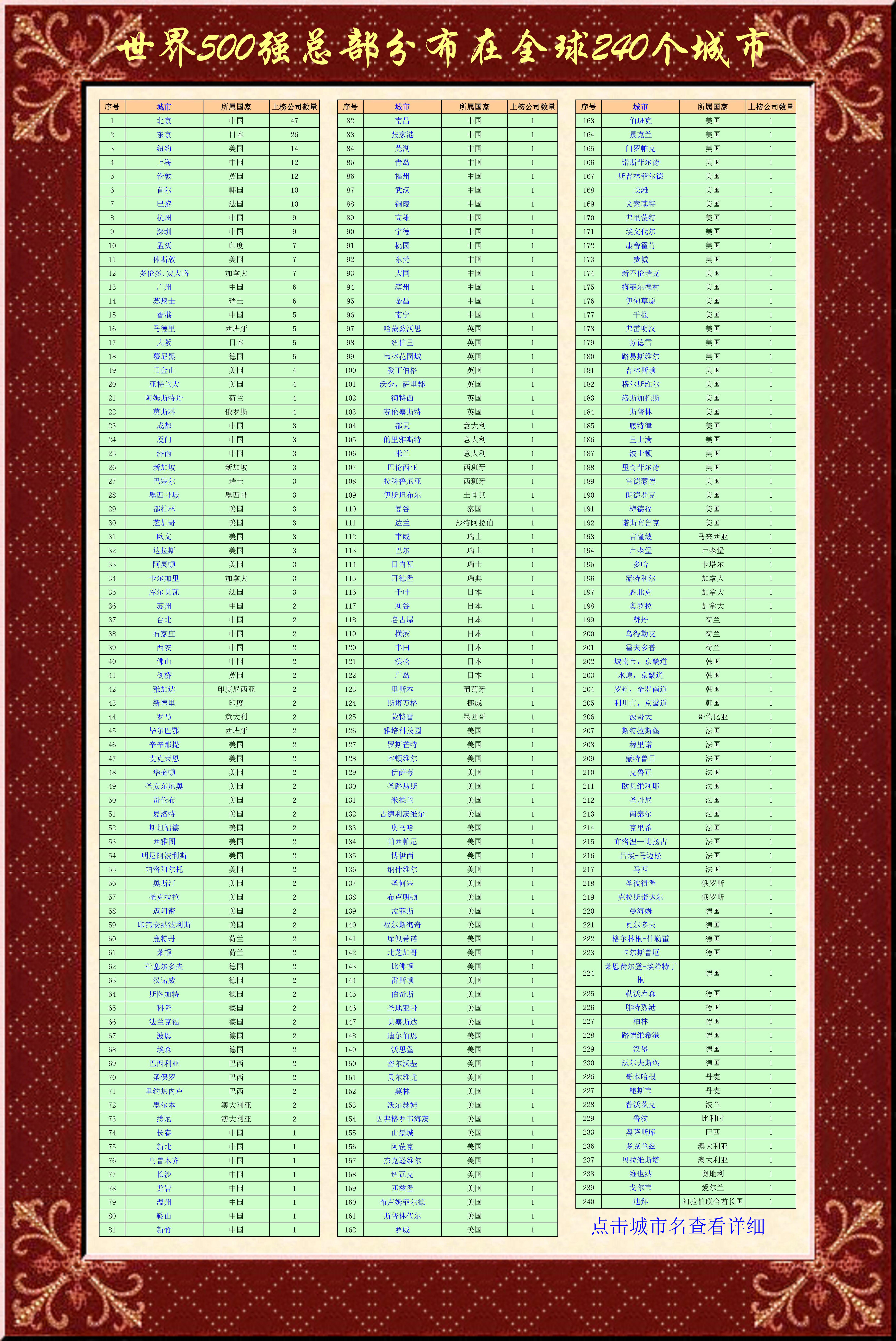 序號 城市 所屬國家 上榜公司數(shù)量