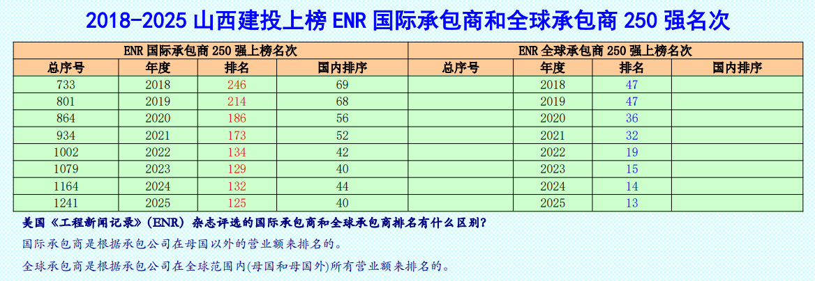 8月21日,美國《工程新聞記錄》(ENR)2025年度“全球承包商250強”和“國際承包商250強”榜單公布,山西建投分別位列第13位和第125位,排名較去年提升1位和7位,保持穩(wěn)步上升態(tài)勢。