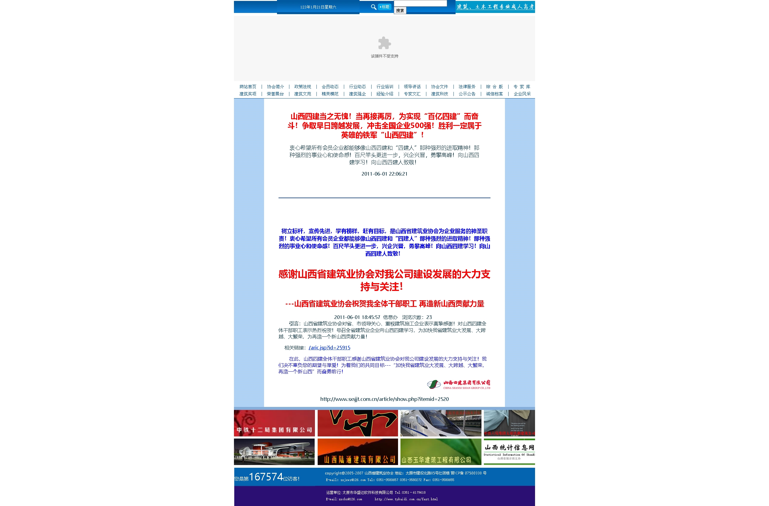 山西四建集團(tuán)有限公司作為山西建筑業(yè)行業(yè)標(biāo)桿,關(guān)注他們是我?guī)资甑牧?xí)慣,一直把這個(gè)企業(yè)的靈魂文化看成是行業(yè)的風(fēng)向標(biāo)和榜樣。尤其特別關(guān)注他們每年的新春賀詞,我在建協(xié)負(fù)責(zé)網(wǎng)站時(shí),多次表揚(yáng)他們,鼓勵(lì)他們,支持他們!你進(jìn)他們的網(wǎng)站看看,現(xiàn)在怎么樣,存在什么問題,如何解決?你有什么感悟,有什么高明的真知灼見呢?