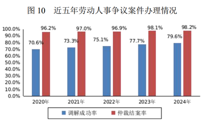 全年全國(guó)各級(jí)勞動(dòng)人事爭(zhēng)議調(diào)解組織和仲裁機(jī)構(gòu)共辦理勞動(dòng)人事爭(zhēng)議案件 425.7 萬涉及勞動(dòng)者 454.9 萬人。全年辦結(jié)爭(zhēng)議案件 415.6 萬件,結(jié)案金額 934.7 億元。全年勞動(dòng)人事爭(zhēng)議調(diào)解成功率 79.6%,仲裁結(jié)案率 98.2%,仲裁終結(jié)率73.7%。