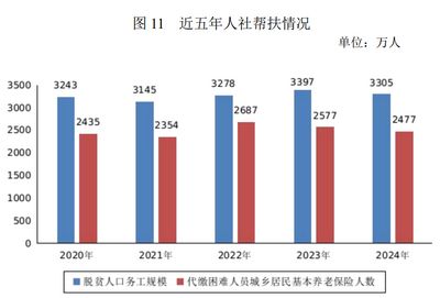 人力資源社會(huì)保障部門認(rèn)真貫徹黨中央、國(guó)務(wù)院決策部署,不斷加大人社幫扶力度,持續(xù)鞏固脫貧攻堅(jiān)成果、助力推進(jìn)鄉(xiāng)村振興。2024 年末脫貧人口務(wù)工規(guī)模達(dá)到 3305 萬人。及時(shí)為 2477 萬低保對(duì)象、特困人員、返貧致貧人口、重度殘疾人等困難人員代繳城鄉(xiāng)居民養(yǎng)老保險(xiǎn)費(fèi)。選派 2.2 萬名高校畢業(yè)生到基層從事支農(nóng)和幫扶鄉(xiāng)村振興服務(wù)。開展專技人才服務(wù)鄉(xiāng)村活動(dòng),組織實(shí)施 60 個(gè)專家服務(wù)基層示范團(tuán)項(xiàng)目。