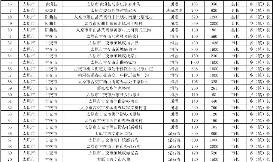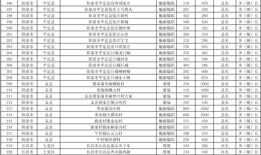 《方案》要求,強化治理搬遷,消除安全隱患。實施中央和省級資金安排9處地質(zhì)災害治理工程項目。其中,河津市、夏縣、石樓縣、臨縣、永和縣、鄉(xiāng)寧縣、榆社縣各1處,武鄉(xiāng)縣2處?!斗桨浮诽岢?,要把縣級配套資金落實到位,加快項目施工進度,確保今年全部竣工;要推進中央和省級資金安排3397戶農(nóng)村地質(zhì)災害避險搬遷工作,落實市縣配套資金,明確時間節(jié)點進度,確保年底全面開工,2024年竣工入住。