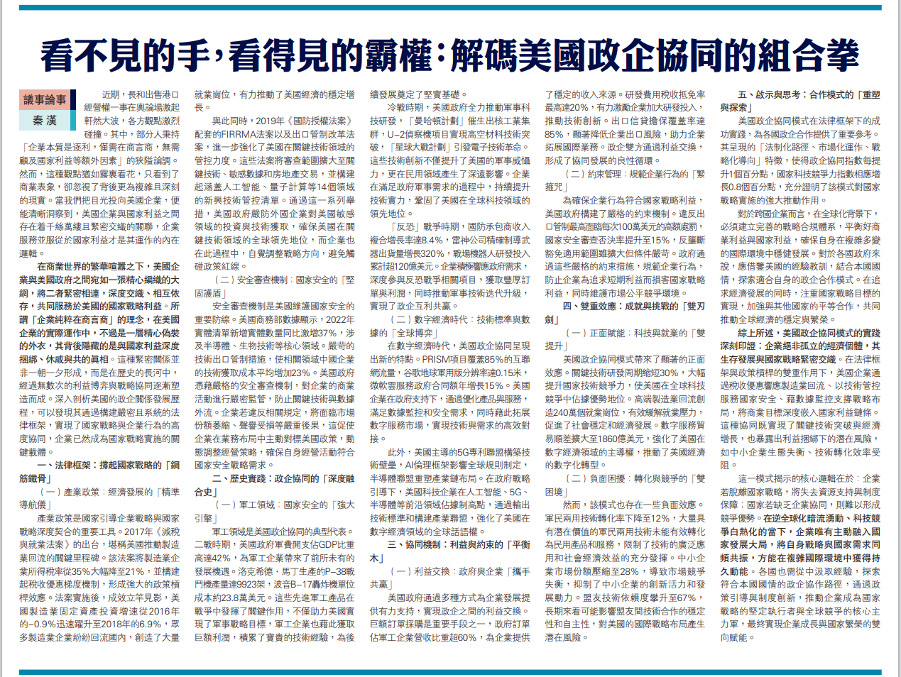綜上所述,美國政企協(xié)同模式的實踐深刻印證:企業(yè)絕非孤立的經(jīng)濟個體,其生存發(fā)展與國家戰(zhàn)略緊密交織。在法律框架與政策杠桿的雙重作用下,美國企業(yè)通過稅收優(yōu)惠響應(yīng)制造業(yè)回流、以技術(shù)管控服務(wù)國家安全、借數(shù)據(jù)監(jiān)控支撐戰(zhàn)略布局,將商業(yè)目標深度嵌入國家利益鏈條。這種協(xié)同既實現(xiàn)了關(guān)鍵技術(shù)突破與經(jīng)濟增長,也暴露出利益捆綁下的潛在風險,如中小企業(yè)生態(tài)失衡、技術(shù)轉(zhuǎn)化效率受阻。