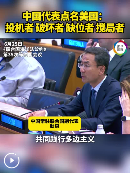 中國(guó)常駐聯(lián)合國(guó)副代表耿爽25日在《聯(lián)合國(guó)海洋法公約》(以下簡(jiǎn)稱《公約》)第35次締約國(guó)會(huì)議上發(fā)言,指出美國(guó)是濫用《公約》規(guī)則的投機(jī)者、國(guó)際海洋秩序的破壞者。