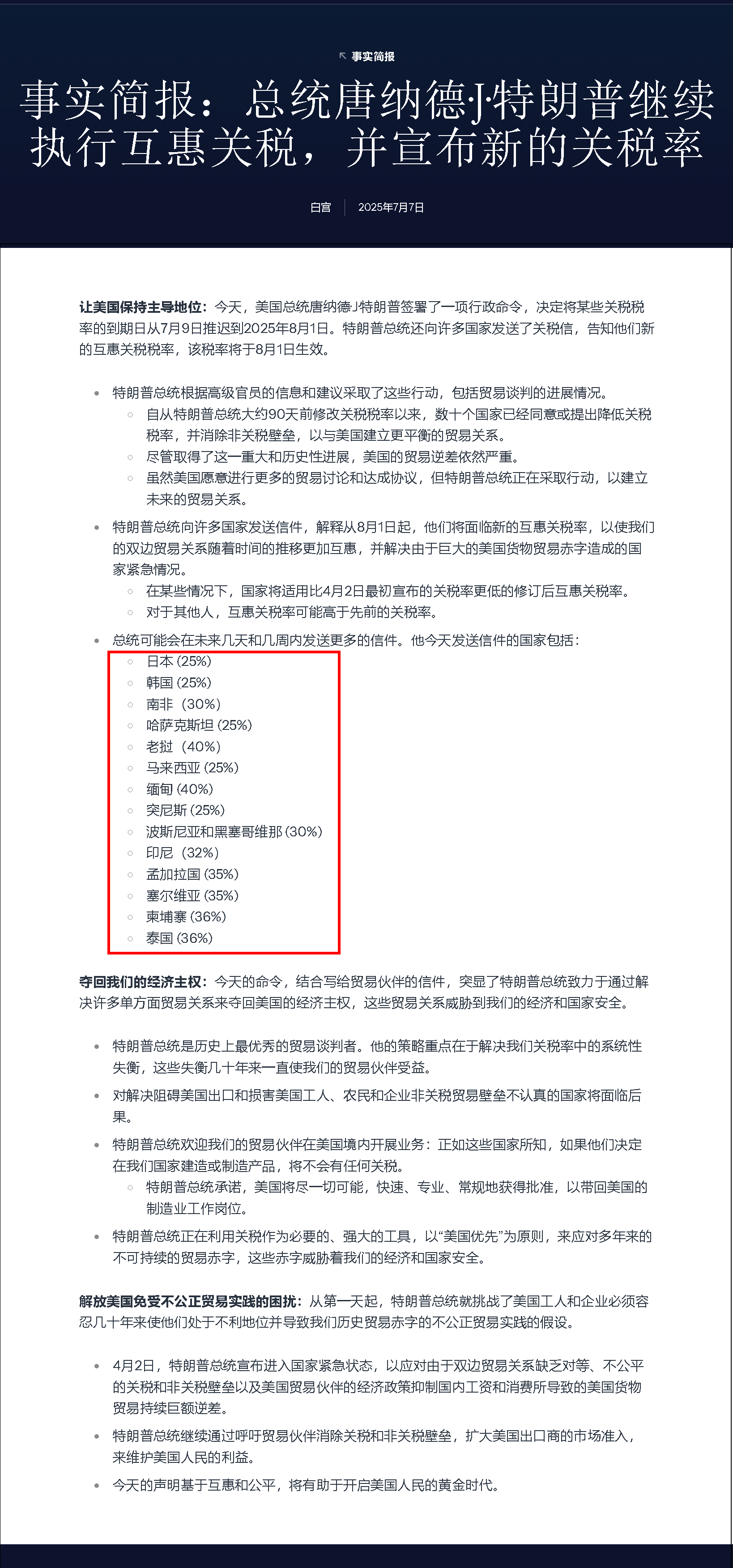 根據(jù)這些信的內(nèi)容,日本、韓國、馬來西亞、突尼斯、哈薩克斯坦將被征收25%的關(guān)稅,南非和波黑將被征收30%的關(guān)稅,印度尼西亞將被征收32%的關(guān)稅,塞爾維亞和孟加拉國將被征收35%的關(guān)稅,泰國和柬埔寨將被征收36%的關(guān)稅,老撾和緬甸則面臨高達(dá)40%的關(guān)稅。