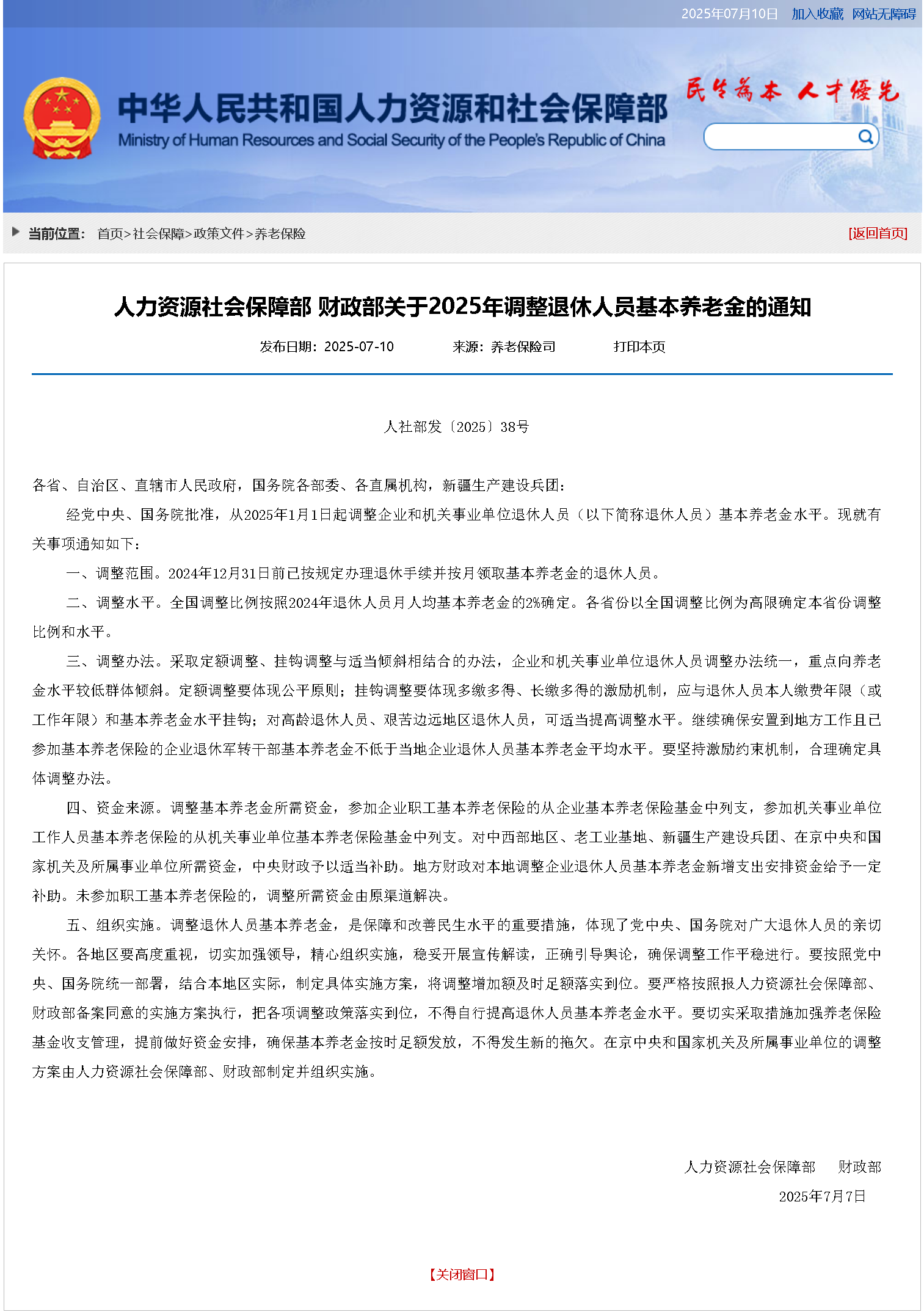 人力資源社會保障部 財政部關于2025年調整退休人員基本養(yǎng)老金的通知