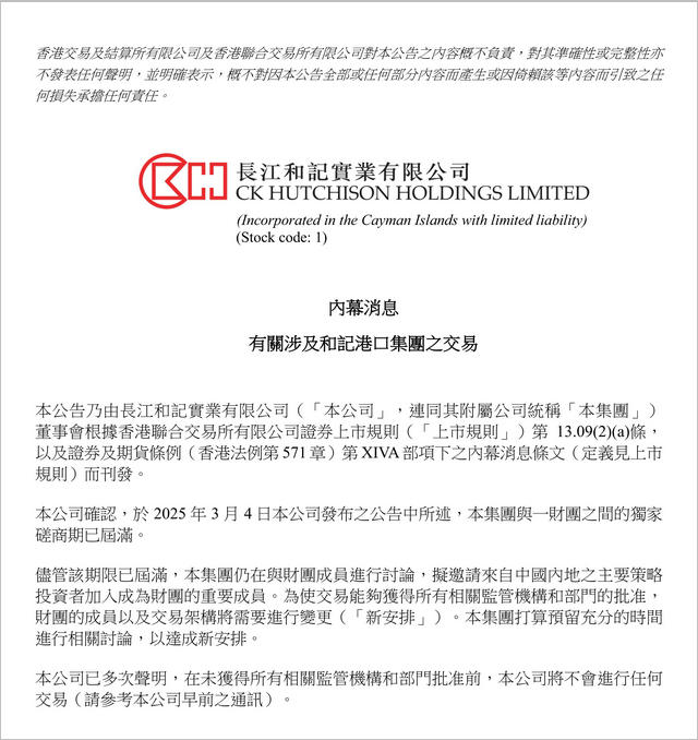 28日早間,長和發(fā)布公告表示公司與一財(cái)團(tuán)之間的獨(dú)家磋商期已屆滿。盡管該期限已屆滿,集團(tuán)仍在與財(cái)團(tuán)成員進(jìn)行討論,擬邀請來自中國內(nèi)地的主要策略投資者加入成為財(cái)團(tuán)的重要成員。長和在公告中提到,為使交易能夠獲得所有相關(guān)監(jiān)管機(jī)構(gòu)和部門的批準(zhǔn),財(cái)團(tuán)的成員以及交易架構(gòu)將需要進(jìn)行變更。集團(tuán)打算預(yù)留充分的時(shí)間進(jìn)行相關(guān)討論,以達(dá)成新安排。