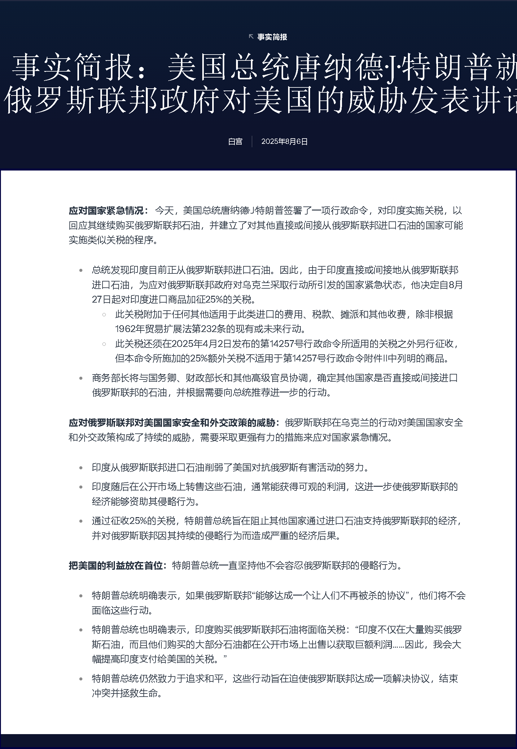 應(yīng)對(duì)國(guó)家緊急情況: 今天,美國(guó)總統(tǒng)唐納德·J·特朗普簽署了一項(xiàng)行政命令,對(duì)印度實(shí)施關(guān)稅,以回應(yīng)其繼續(xù)購(gòu)買(mǎi)俄羅斯聯(lián)邦石油,并建立了對(duì)其他直接或間接從俄羅斯聯(lián)邦進(jìn)口石油的國(guó)家可能實(shí)施類(lèi)似關(guān)稅的程序。