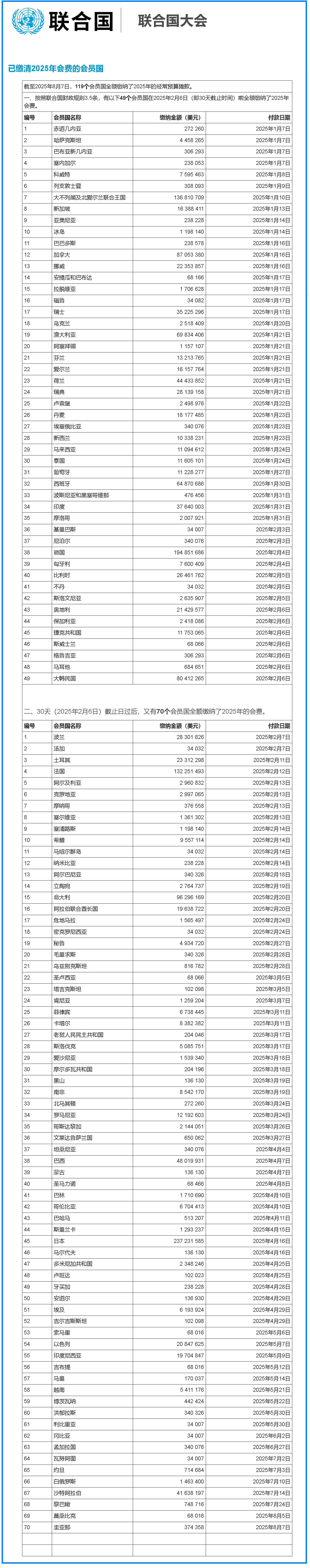二、30天(2025年2月6日)截止日過后,又有70個(gè)會(huì)員國全額繳納了2025年的會(huì)費(fèi)。