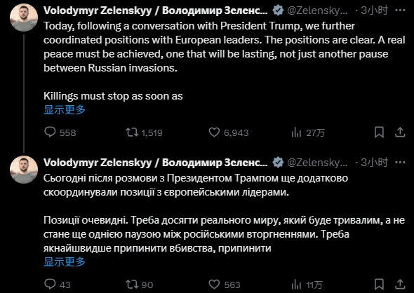 同日,歐盟委員會(huì)官網(wǎng)發(fā)布英、法、德、意、芬蘭、波蘭及歐盟領(lǐng)導(dǎo)人的聯(lián)合聲明。聲明稱,各方領(lǐng)導(dǎo)人贊賞特朗普為制止俄烏沖突、實(shí)現(xiàn)公正持久和平所作的努力。但各國(guó)認(rèn)為,烏克蘭必須獲得堅(jiān)不可摧的“安全保障”,且烏克蘭領(lǐng)土問(wèn)題應(yīng)由烏方自主決定。聲明還呼吁強(qiáng)化對(duì)俄制裁。