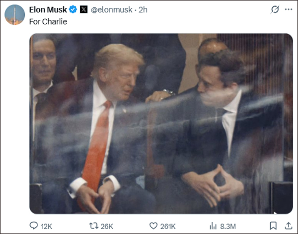 公開鬧翻幾個(gè)月后,美國總統(tǒng)特朗普與知名企業(yè)家馬斯克于9月21日在查理·柯克追悼會(huì)現(xiàn)場(chǎng)同框亮相,兩人相鄰而坐并握手交談。
