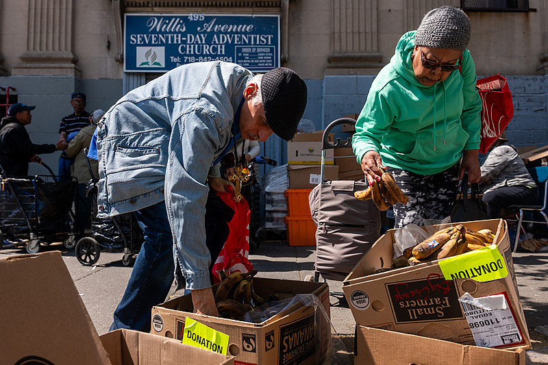 當(dāng)?shù)貢r(shí)間2025年4月23日,美國(guó)紐約,民眾在布朗克斯一座教堂外領(lǐng)取食物。 視覺中國(guó)