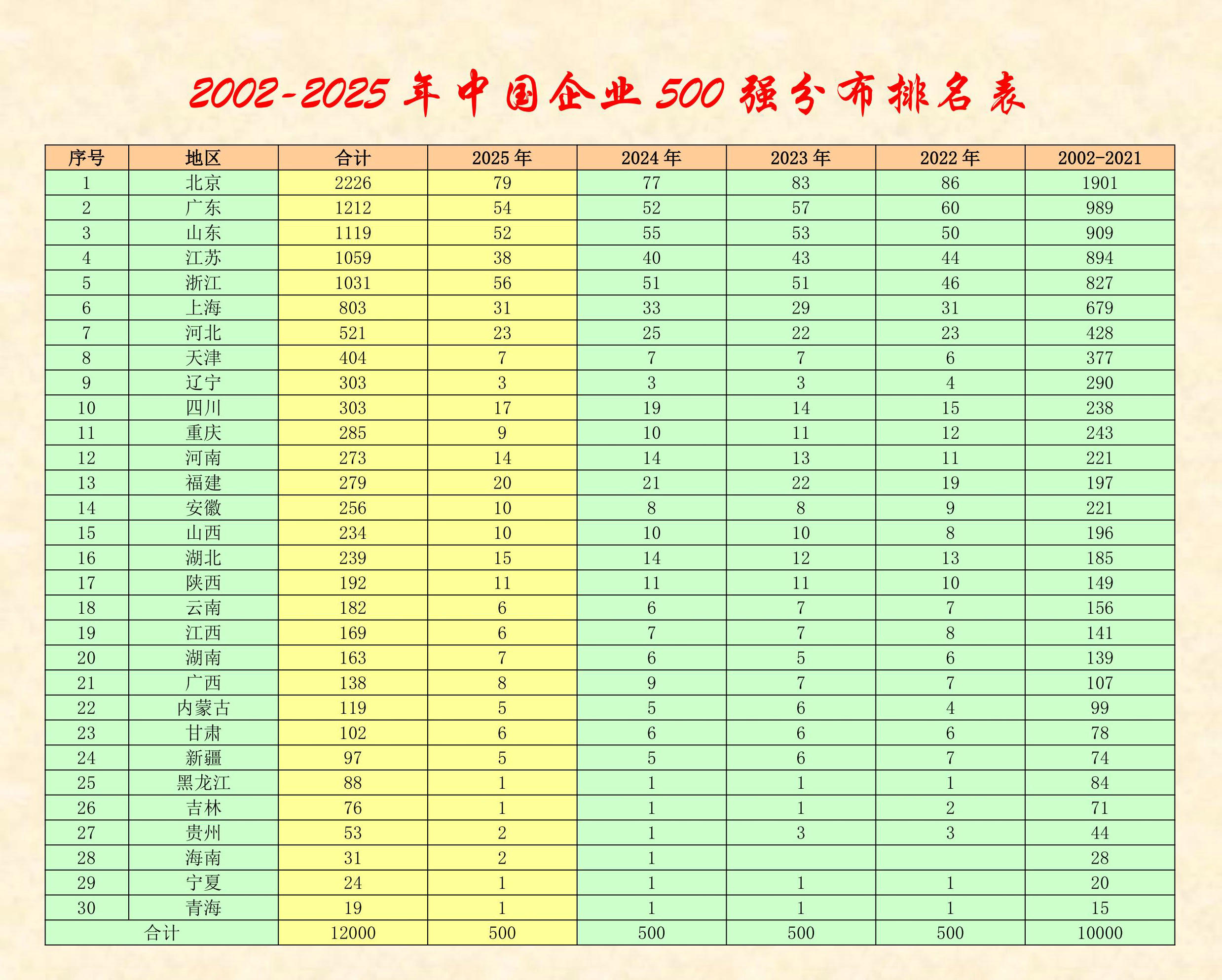 2025中國企業(yè)500強(qiáng)共分布在30個?。ㄗ灾螀^(qū)、直轄市)中,分布最多的五個地區(qū)依次是北京、浙江、廣東、山東和江蘇。