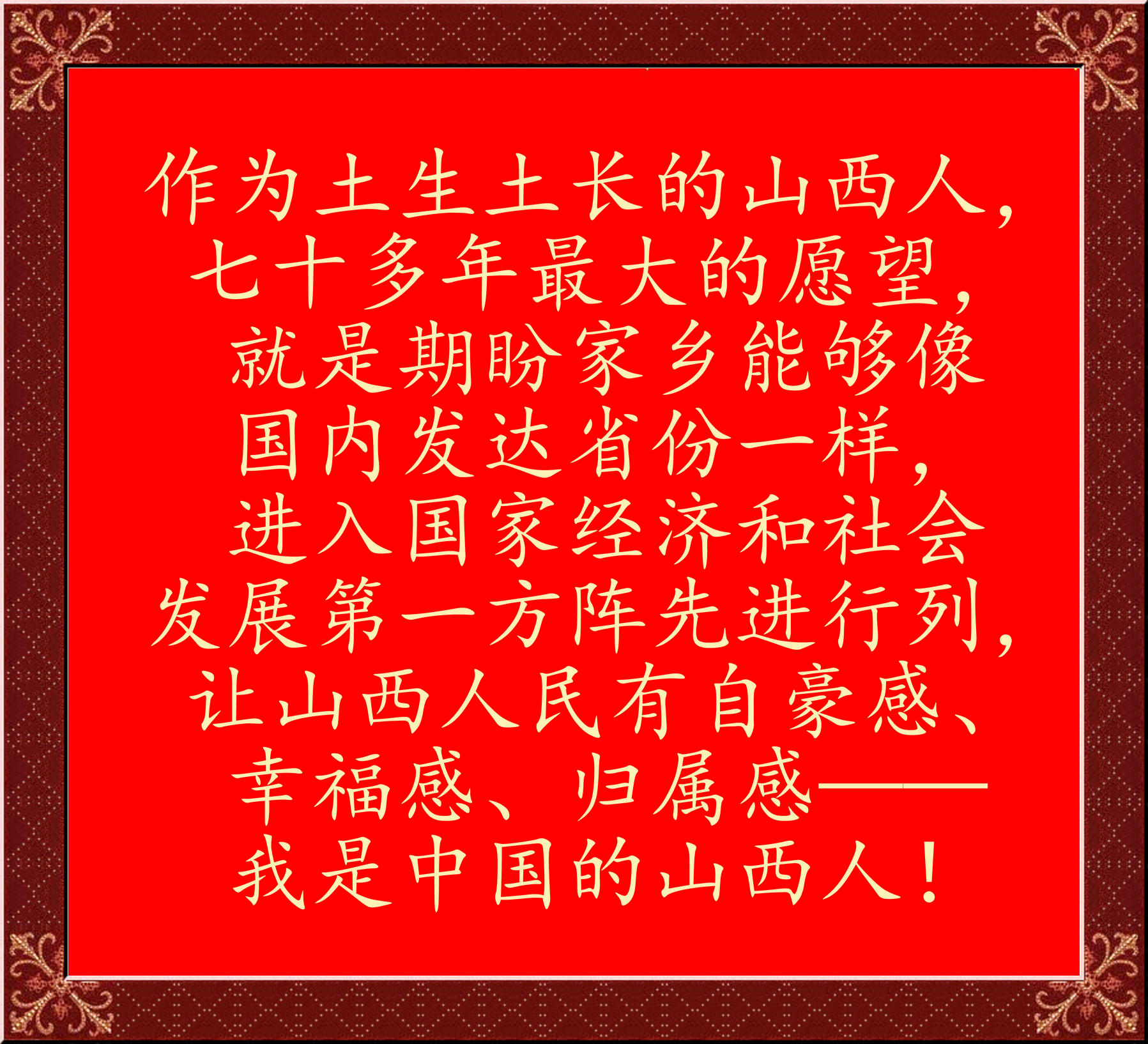 作為土生土長(zhǎng)的山西人,七十多年最大的愿望,就是期盼家鄉(xiāng)能夠像國(guó)內(nèi)發(fā)達(dá)省份一樣,進(jìn)入國(guó)家經(jīng)濟(jì)和社會(huì)發(fā)展第一方陣先進(jìn)行列,讓山西人民有自豪感、幸福感、歸屬感——我是中國(guó)的山西人!